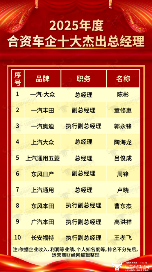 日前,由国内知名财经媒体——运营商财经网独家编排的“2025年度合资车企十大杰出总经理”名单正式出炉!都有哪些高管脱颖而出?接下来运营商财经网将正式揭晓。