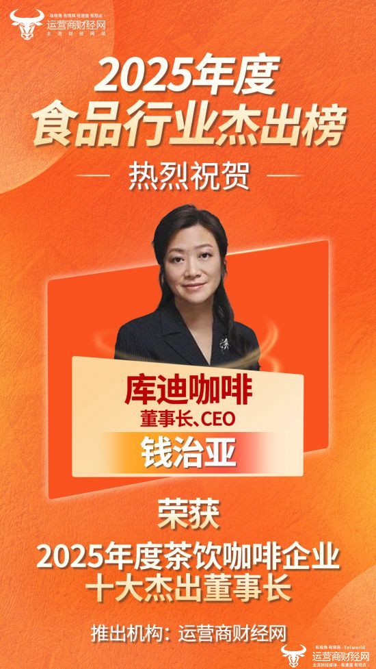近日,运营商财经网独家打造的“2025年度茶饮咖啡十大杰出董事长”正式揭晓,库迪咖啡董事长兼CEO钱治亚成功上榜!