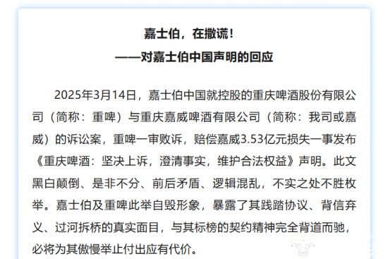 而重庆啤酒不服该判决,提起上诉,并在其官方公众号发表《重庆啤酒:坚决上诉,澄清事实,维护合法权益》一文。随即,重庆嘉威发布《嘉士伯,在撒谎!》一文对其作出回应,双方矛盾升级。