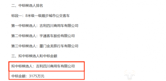 最终,吉利四川商用车有限公司中标标段一,中标金额3175万元,比预算低了225万元;