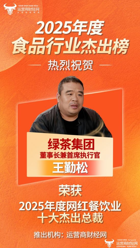近日,由运营商财经网独家编制的“2025年度网红餐饮业十大杰出总裁”名单正式揭晓,绿茶董事长兼首席执行官王勤松成功入选!
