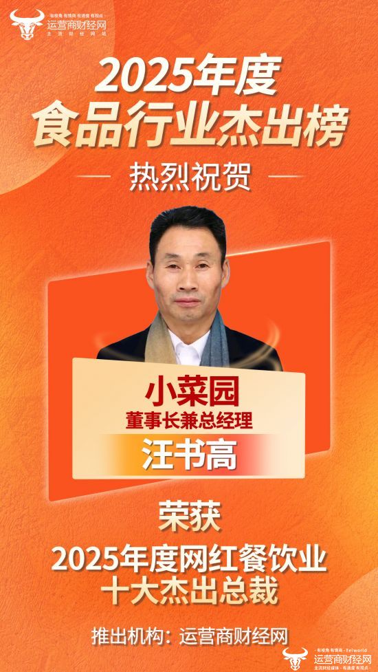 近日,运营商财经网正式推出“2025年度网红餐饮业十大杰出总裁”榜单,小菜园董事长兼总经理汪书高榜上有名,可喜可贺!