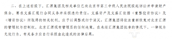 同时,汇源集团称已向北京市第三中级人民法院提起诉讼并申请财产保全,要求诸暨文盛汇履行合同义务并承担违约责任,文盛资产及诸暨文盛汇所取得的相关权利应予以调整或归于消灭,汇源集团将依法恢复对北京汇源的管理权与控制权。