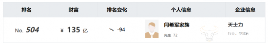 值得一提的是,2025胡润百富榜显示,闫希军家族以135亿元的财富位列榜单第504位,而在2024胡润百富榜中,闫希军家族财富以125亿元的身家排在第410位,也就是说,虽然其排名下降近百名,但身家财富却有所上涨。
