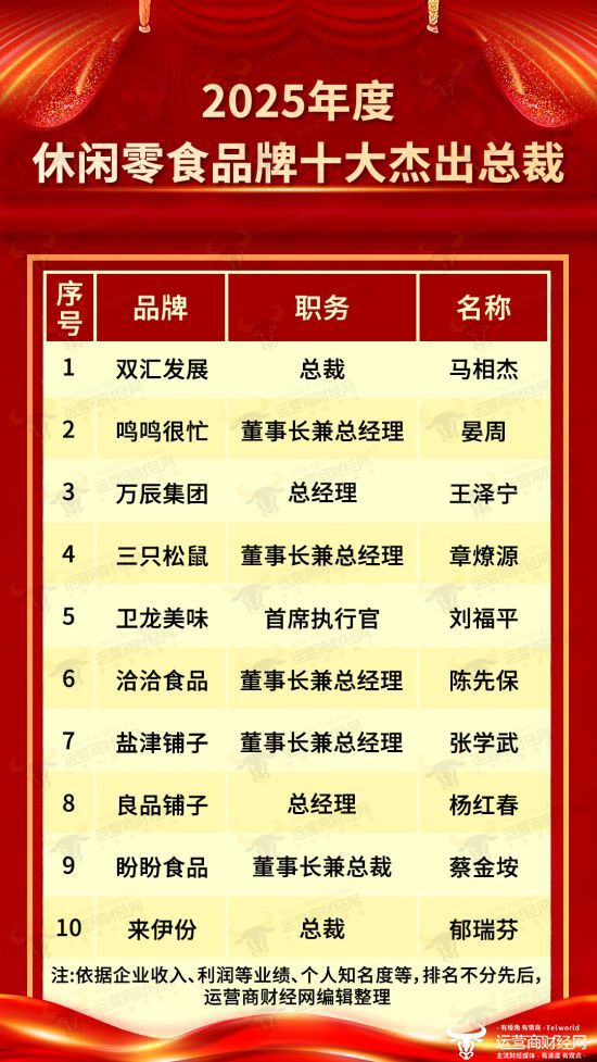 日前,由国内知名财经网运营商财经网独家打造的“2025年度休闲零食品牌十大杰出总裁”榜单正式公布,接下来运营商财经网将一一揭晓。