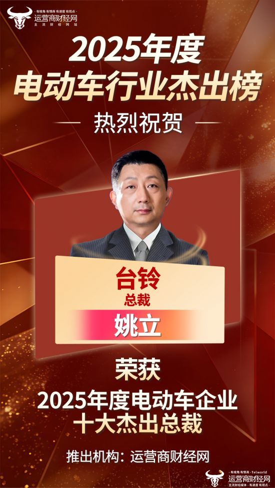 通过综合考量企业整体业绩、高管个人知名度等多方面的因素,台铃总裁姚立凭借优秀的表现,入选“2025年度电动车十大杰出总裁”。