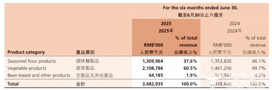 财报数据显示,卫龙今年上半年实现总营业收入34.83亿元,同比上升18.5%,期内利润为7.36亿元,同比增长18.5%。其中以魔芋爽为代表蔬菜制品实现收入21.09亿元,同比增长44.3%,营收占比也从49.7%增至60.5%。