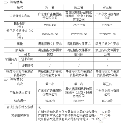 值得一提的是,广州市时空视点数字科技有限公司和广东省广告集团股份有限公司虽然参与竞标,但是分别以81.74分、81.48分的综合得分遗憾出局,这两家公司也是汽车公关领域颇具名气的企业,此次未能中标折射出本次竞争的残酷性。