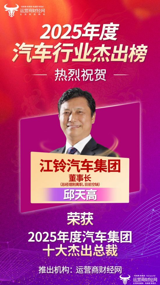 基于2025年国内汽车行业的整体发展情况,国内知名财经媒体运营商财经网独家编排了“2025年度汽车集团十大杰出总裁”榜单,旨在表彰优秀的车企和领导人,在业内有着较强的影响力。其中,凭借着优异的表现,江铃汽车集团董事长邱天高上榜。