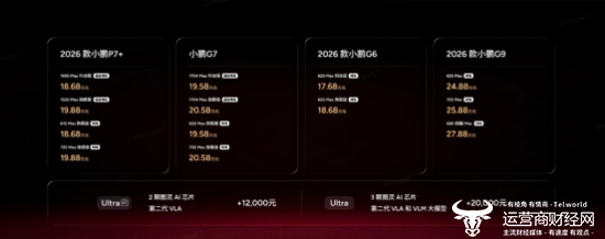 今日,在2026小鹏全球新品发布会上,小鹏汽车正式发布2026 款小鹏 P7+、小鹏 G7 超级增程、2026 款小鹏 G6、2026 款小鹏 G9。其中2026款小鹏P7+ 全球36国同步发布,新车有超级增程和纯电两种能源形式,超级增程有1550 Max 科技版和1550 Max 旗舰版,官方指导售价为18.68万元和19.88万元;纯电有615 Max旗舰版和725 Max 旗舰版,官方指导售价为18.68万元和19.88万元。2026款小鹏G7推出四个版本,超级增程1704 Max 科技版和1704 Max 旗舰版,官方指导售价为19.58万元和20.58万元;纯电602 Max 旗舰版和702 Max 旗舰版,官方指导售价为19.58万元和20.58万元。2026 款小鹏 G6推出纯电625 Max 科技版和625 Max 旗舰版,官方指导售价为17.68万元和18.68万元。2026 款小鹏 G9推出纯电625Max、725 Max和680 四驱Max版,官方指导售价为24.88万元、25.88万元和27.88万元。