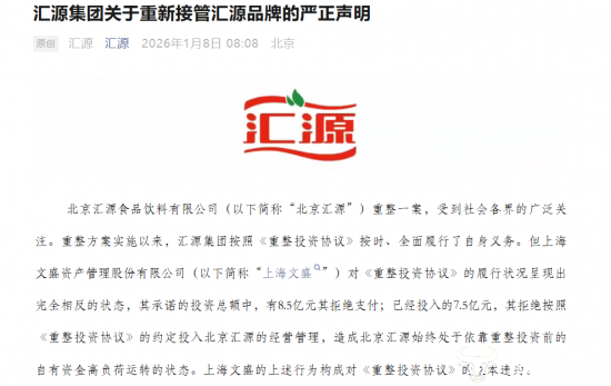 声明显示,重整投资人上海文盛未履行《重整投资协议》约定,拖欠8.5亿元的投资款,已投入的7.5亿元也未按约定投入北京汇源的经营管理,还违规向代工厂采购未经汇源集团食品安全监控体系监督认定的果汁原料,生产非汇源体系原料的冒牌产品。由此,汇源集团宣布全面接管北京汇源,并不再履行原协议及从合同。