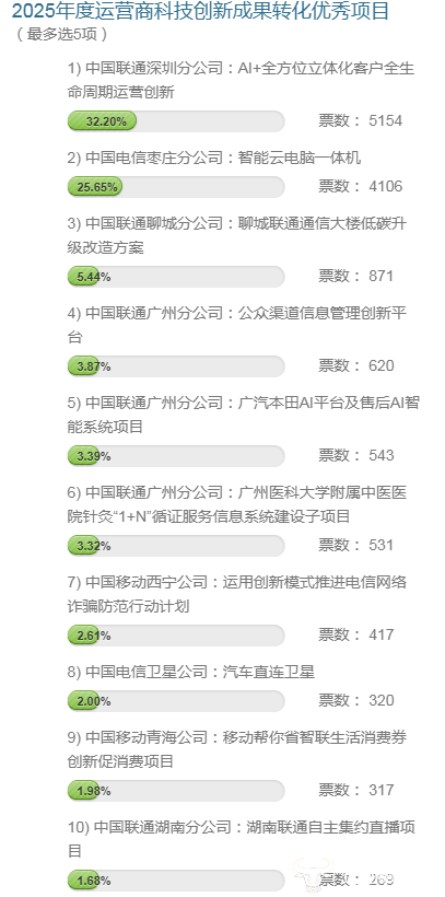 日前,由运营商财经网举办的一年一度财经TMT“领袖榜”评选活动,投票通道已经开启。现对“2025年度运营商科技创新成果转化优秀项目”奖项的暂时投票情况,进行发布。