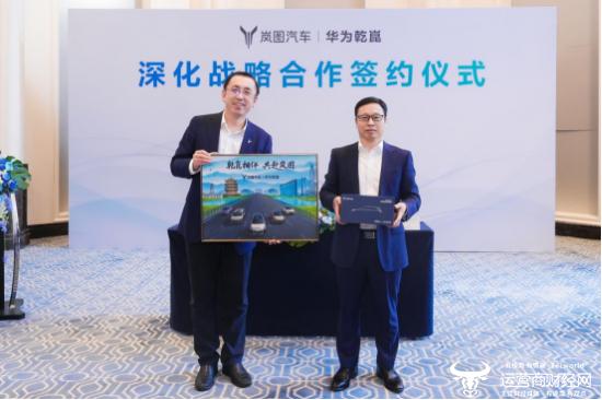 (岚图汽车与华为引望签署战略深化合作,岚图汽车董事长、党委书记卢放向引望CEO靳玉志赠送岚图泰山车模)