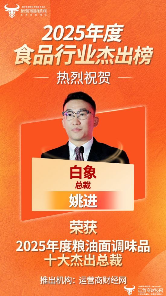日前,运营商财经网独家打造的“2025年度粮油面调味品十大杰出总裁”榜单正式推出,白象食品总裁姚进成功上榜!