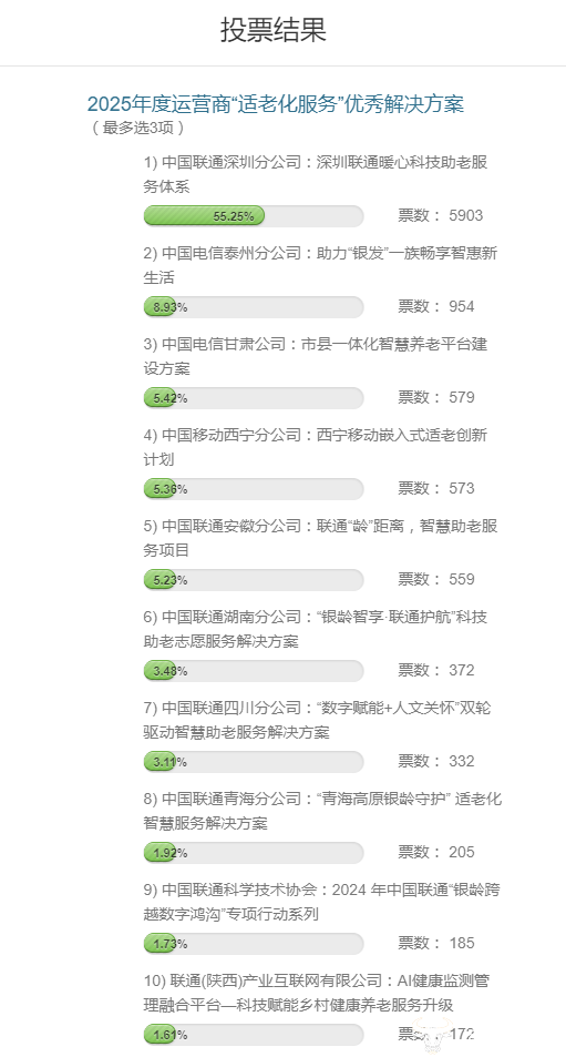 此外,湖南联通的“‘银龄智享·联通护航’科技助老志愿服务解决方案”、四川联通的“‘数字赋能+人文关怀’双轮驱动智慧助老服务解决方案”、青海联通“‘青海高原银龄守护’ 适老化智慧服务解决方案”、中国联通科学技术协会的“2024 年中国联通‘银龄跨越数字鸿沟’专项行动系列”、联通(陕西)产业互联网有限公司的“AI健康监测管理融合平台—科技赋能乡村健康养老服务升级”等方案也跻身前十。