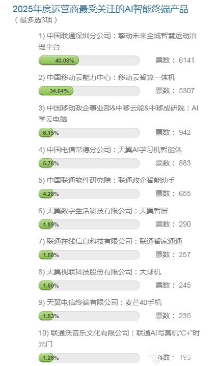 此外,中国移动政企事业部&中移云能&中移成研院的“AI学云电脑”、常德电信的“天翼AI学习智能体”、中国联通软件研究院的“联通政企智能助手”则分别位居第三、第四、第五,票数差距较近。