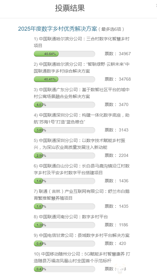 目前,在“2025年度数字乡村优秀解决方案”投票评选中,哈尔滨联通的“三合村数字化智慧乡村项目”、“‘智联绿野·云耕未来’中国联通数字乡村综合解决方案”票数领先,稳居第一、第二。