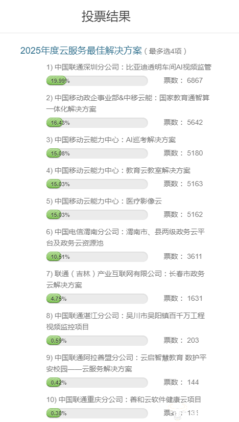 此外,渭南电信的“渭南市、县两级政务云平台及政务云资源池”、联通(吉林)产互公司的“长春市政务云解决方案”、湛江联通的“吴川市吴阳镇百千万工程视频监控项目”、阿拉善盟联通的“云启智慧教育 数护平安校园——云服务解决方案”、重庆联通的“善和云软件健康云项目”也进入前十,不过部分票数差距较大。