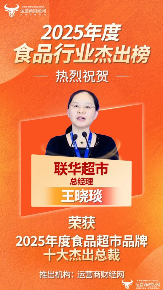 近日,由运营商财经网独家编制的“2025年度食品超市品牌十大杰出总裁”名单正式揭晓,联华超市总经理王晓琰成功入选!