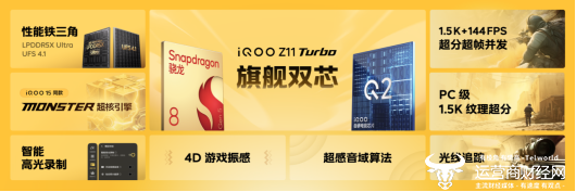 iQOO Z11 Turbo搭载第五代骁龙8旗舰移动平台,采用台积电3nm先进制程工艺,CPU性能提升36%,功耗降低42%;GPU性能提升11%,功耗降低28%,性能释放更高效。搭配自研电竞芯片Q2与Monster超核引擎,构成“同档唯一双芯”组合,实现PC级纹理超分+144FPS超帧并发,游戏画质与流畅度同步跃升。