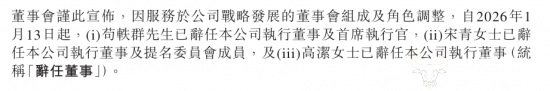公告显示,因服务于公司战略发展的董事会组成及角色调整,自2026年1月13日起,苟轶群辞任公司执行董事及首席执行官职位,由海底捞创始人、董事会主席张勇接任,而苟轶群则继续专注于推动集团管理流程的智能化、自动化以及智能中台建设。