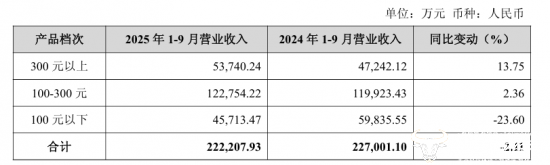 此外,金徽酒自身产品结构也比较稳健。2025年前三季度,公司营收主力100-300元产品营业收入为12.28亿元,同比增长2.36%,300元以上产品收入5.37亿元,同比增长13.75%,而100元以下产品同比下降23.60%至4.57亿元,为金徽酒唯一下降的产品档次,拖累了公司整体业绩。