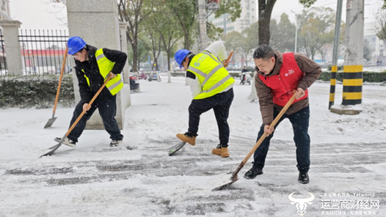 (湖北移动志愿者清扫辅路和人行道积雪,确保道路安全畅通)