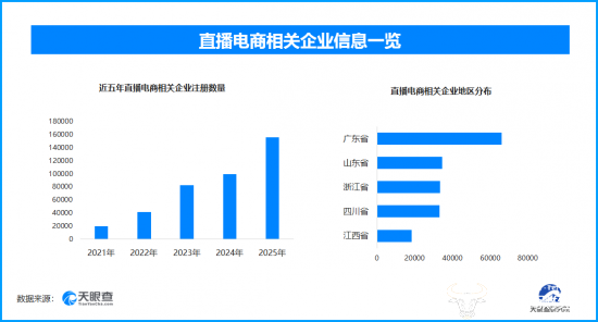 从具体数据来看,2025年新增注册相关企业超15.5万余家,从企业注册数量趋势来看,近五年间,直播电商相关企业的注册数量呈现出逐年增长的态势,并在2025年达到顶峰。