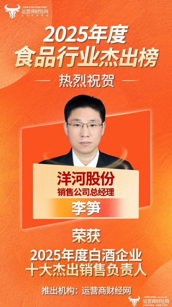 近日,由运营商财经网独家编制的“2025年度白酒企业十大杰出销售负责人”名单正式揭晓,洋河股份销售公司总经理李笋成功入选!