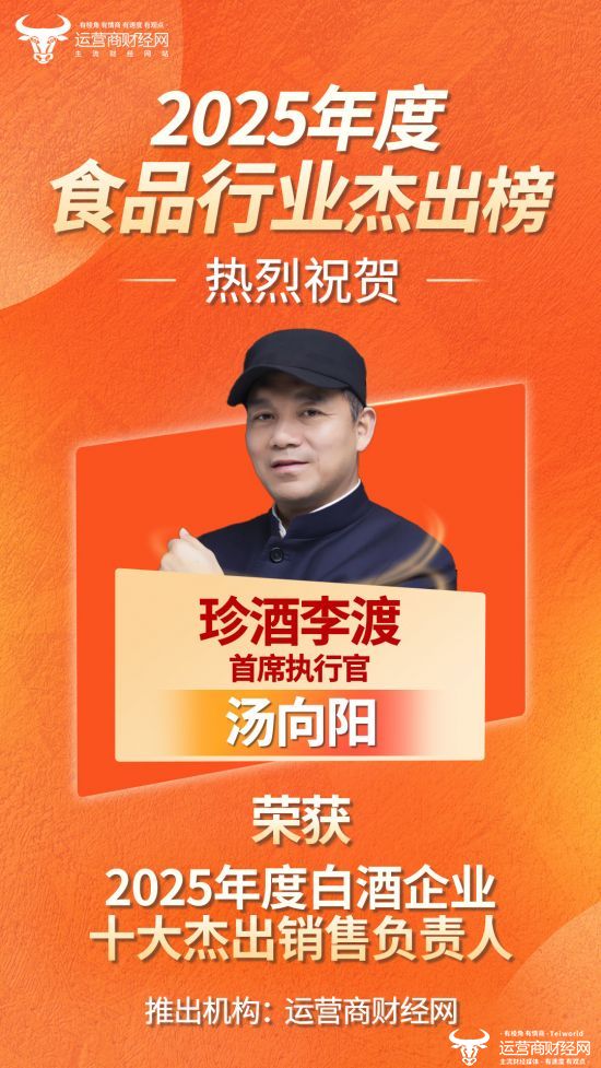近日,运营商财经网正式推出“2025年度白酒企业十大杰出销售负责人”榜单,珍酒李渡首席执行官汤向阳榜上有名,可喜可贺!
