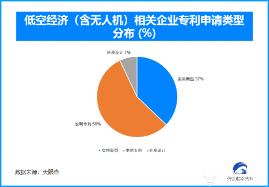 天眼查专业版数据显示,在低空经济、无人机领域的相关专利申请数量截至目前已达到17.9万余件。其中,发明专利占到56%的比值,充分说明了该领域的技术基因;实用新型专利占比37%;外观设计占比7%。