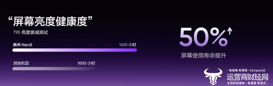 在亮度方面,真我Neo8实现手动最高1000nit、全局峰值1800nit、局部峰值6500nit以及阳光显示3800nit的全场景顶级通透体验,阳光显示状态下103% P3超广色域让色彩还原更准确,高亮不再惨白。新发光材料更带来了更耐久的发光寿命,真我Neo8采用更严苛的T95亮度衰减指标,实测成绩长达1500小时,屏幕寿命较行业提升50%。护眼方面支持全新绿野护眼方案,支持全亮度DC调光,SVM低至0.05,并获得了莱茵无频闪认证,硬件级低蓝光与AI护眼功能,全场景守护用眼健康,让久玩更护眼。