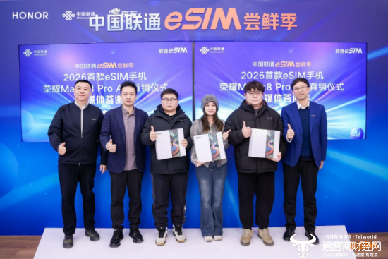 2026年1月23日上午,中国联通eSIM尝鲜季2026首款eSIM手机——荣耀Magic8 Pro Air首销仪式暨媒体答谢会在北京西单联通营业厅隆重举行。中国联通集团市场部副总经理尹少春、联通华盛总经理李立新、荣耀中国区副总裁徐涛、北京联通副总经理秦洋、联通华盛副总经理陈丰伟、京东3C数码事业群手机事业二部总经理卢志锋、京东3C数码事业群运营商部总经理庞誉等嘉宾共同出席,见证2026国内首款eSIM手机正式上市,标志着中国联通与荣耀、京东三方战略合作迈入全新阶段。