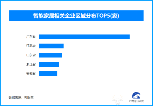 从区域分布来看,广东省智能家居相关企业数量位居首位,以超3.5万余家相关企业数量,占全国总数的29.97%。排在其后的是江苏省、山东省、浙江省和安徽省。