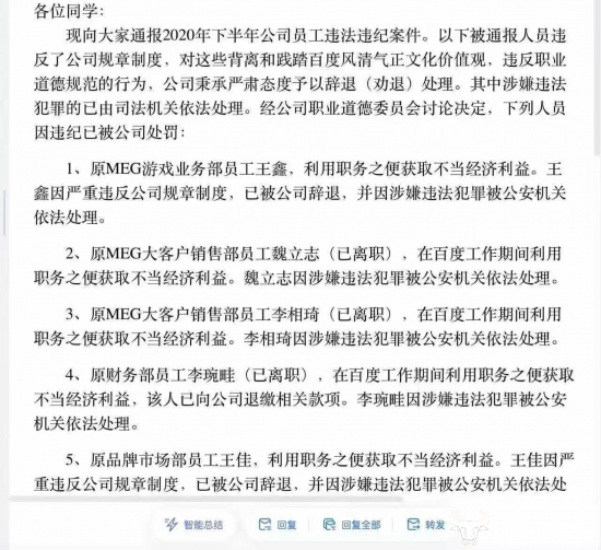 通过公开渠道可查到,2021年《某度职业道德违法违纪处理情况通告》中称,某度确实在2021年初对2020年下半年公司员工违法违纪案件进行过通报。当时原品牌市场部员工王某利用职务之便获取不当经济利益。王某因严重违反公司规章制度,已被公司辞退,并因涉嫌违法犯罪被相关单位依法处理。