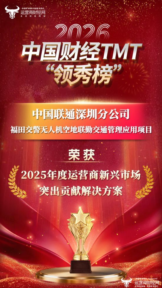 盛典期间,主办方运营商财经网正式公布了年度评选获奖名单,其中,深圳联通的福田交警无人机空地联勤交通管理应用项目荣获“2025年度运营商新兴市场突出贡献解决方案”,热烈祝贺!