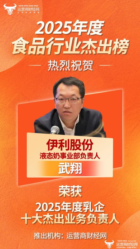 近日,运营商财经网正式推出“2025年度乳企十大杰出业务负责人”榜单,伊利液态奶事业部总经理武翔成功上榜!