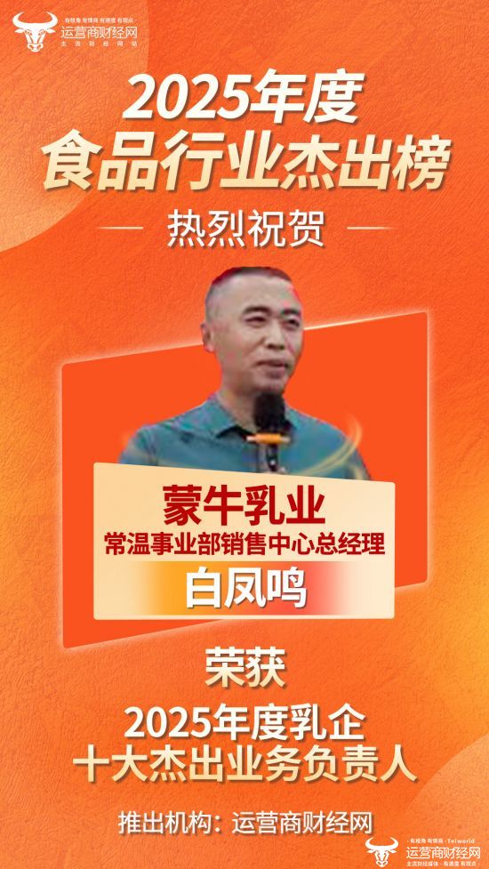 近日,由运营商财经网独家编制的“2025年度乳企十大杰出业务负责人”名单正式揭晓,蒙牛常温事业部销售中心总经理白凤鸣成功入选!