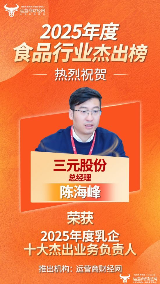 近日,由运营商财经网推出的“2025年度乳企十大杰出业务负责人”名单正式公布,三元股份总经理陈海峰成功入选!