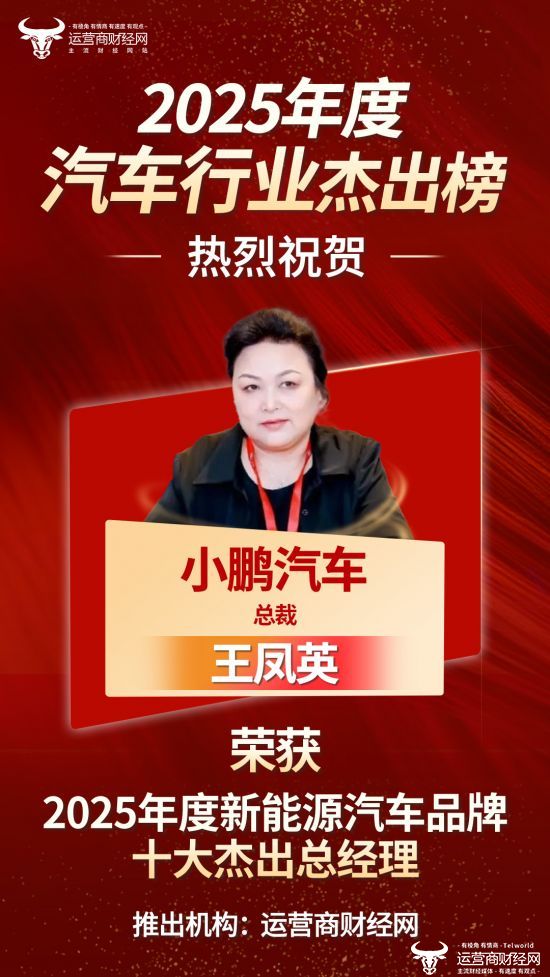 基于对国内汽车行业的整体洞察,运营商财经网独家打造了“2025年度新能源汽车品牌十大杰出总经理”榜单,如今已经正式确定上榜名单。其中,小鹏汽车总裁王凤英榜上有名!