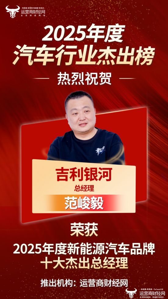 基于2025年国内汽车行业的整体发展情况,国内知名财经媒体——运营商财经网独家编排了“2025年度新能源汽车品牌十大杰出总经理”榜单,旨在表彰优秀的车企和领导人,在业内有着较强的影响力。