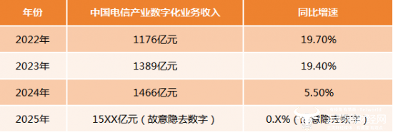 据透露,截至2025年底,中国电信产数业务收入同比增幅尚不到1%。