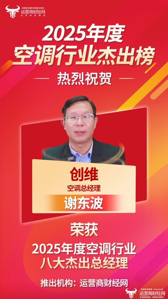 其中,创维空调总经理谢东波凭借出色的表现,入选“2025年度空调行业八大杰出总经理”。