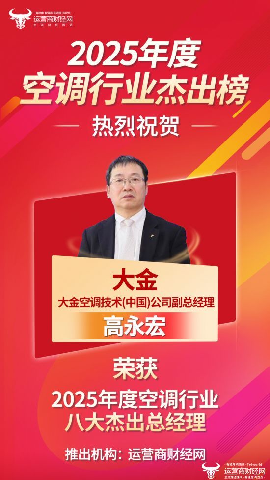 近日,运营商财经网独家打造的“2025年度空调行业八大杰出总经理”具体上榜名单正式公布。通过综合考量企业业绩以及高管个人知名度等多种因素,大金空调技术(中国)公司副总经理高永宏成功上榜。