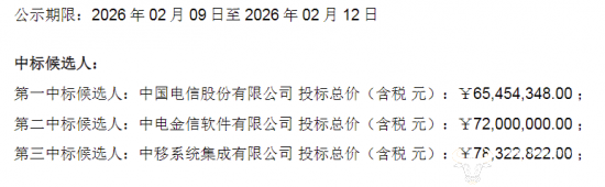 需要注意的是,项目计划选定一家中标人,若公示期无变动,报价最低的中国电信将成功中标。