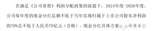 洋河股份发布的现金分红回报规划(2025年度-2027年度)公告显示,2025年度至2027年度,公司每年度现金分红总额不低于当年实现归母净利润的100%,也就是把全年净利润全部分完。