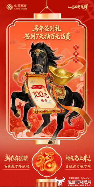 新春有骐骥,福气马上来!锁定中国移动APP,天天有惊喜!进入中国移动APP首页“签到有礼”页面,完成签到有机会得话费或流量福利,累计签到7次就有机会抽取100元话费,做任务攒心愿金可兑换至高10元话费,让新春的实惠与福气相伴!