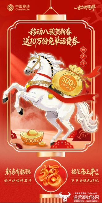 “移动八骏贺新春,送10万份免单话费券”移动年度报告设置八骏马场馆,全面呈现涵盖用户身份、足迹、宽带、爱购、通信等多维度信息的年度报告数据。用户逛骏马村激活名马,可触发“抽月费免单”机会,至高可得300元话费兑换券,还有机会抽取至高10GB流量券。