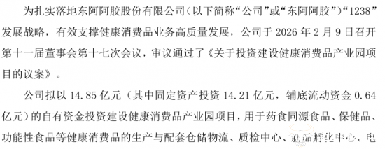 公告显示,为打造一个现代健康消费品的综合性基地,东阿阿胶拟以14.85亿元的的自有资金,投资建设健康消费品产业园项目,其中固定资产投资14.21亿元,铺底流动资金0.64亿元,为东阿阿胶近年来最大规模的单笔投资之一。