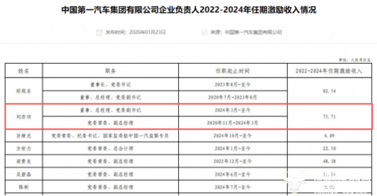与另一家汽车央企东风汽车相比,2024年,时任东风汽车总经理的周治平应付年薪65.15万元,社会保险、企业年金等单位缴存部分为19.88万元。他在东风任职时间不长,和刘亦功几乎同期上任总经理,但他如今已经调离,在2024年3月至2024年12月期间,周治平获得的激励收入14.68万元,其薪酬合计约99.71万元,不如刘亦功高。